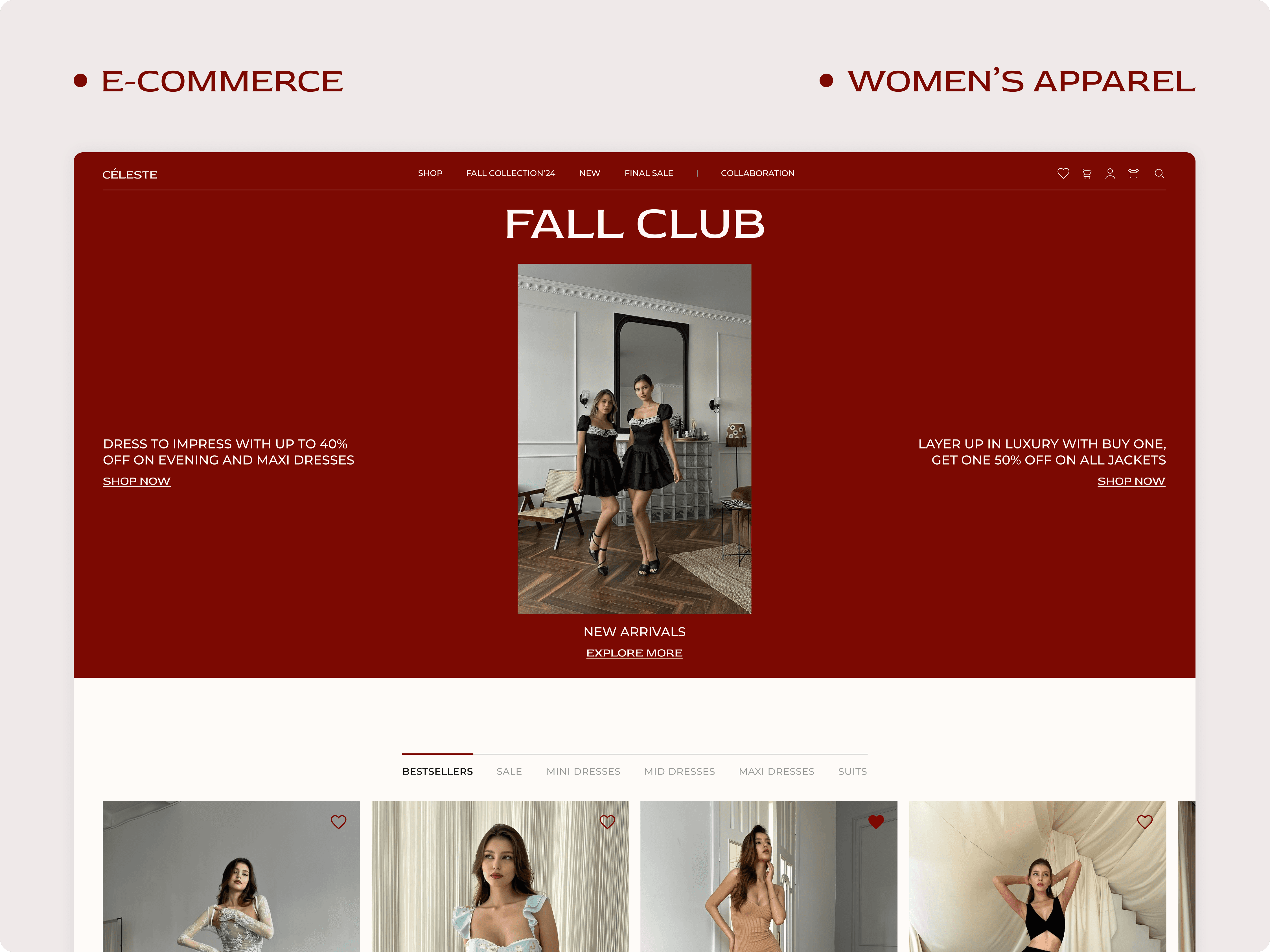 An online store for a modern women’s fashion brand. Goal: fast product discovery, clear flows and a smooth checkout on mobile and desktop. I led design end to end, collaborated with a developer and a project manager and worked directly with the client. I presented the final design decisions.