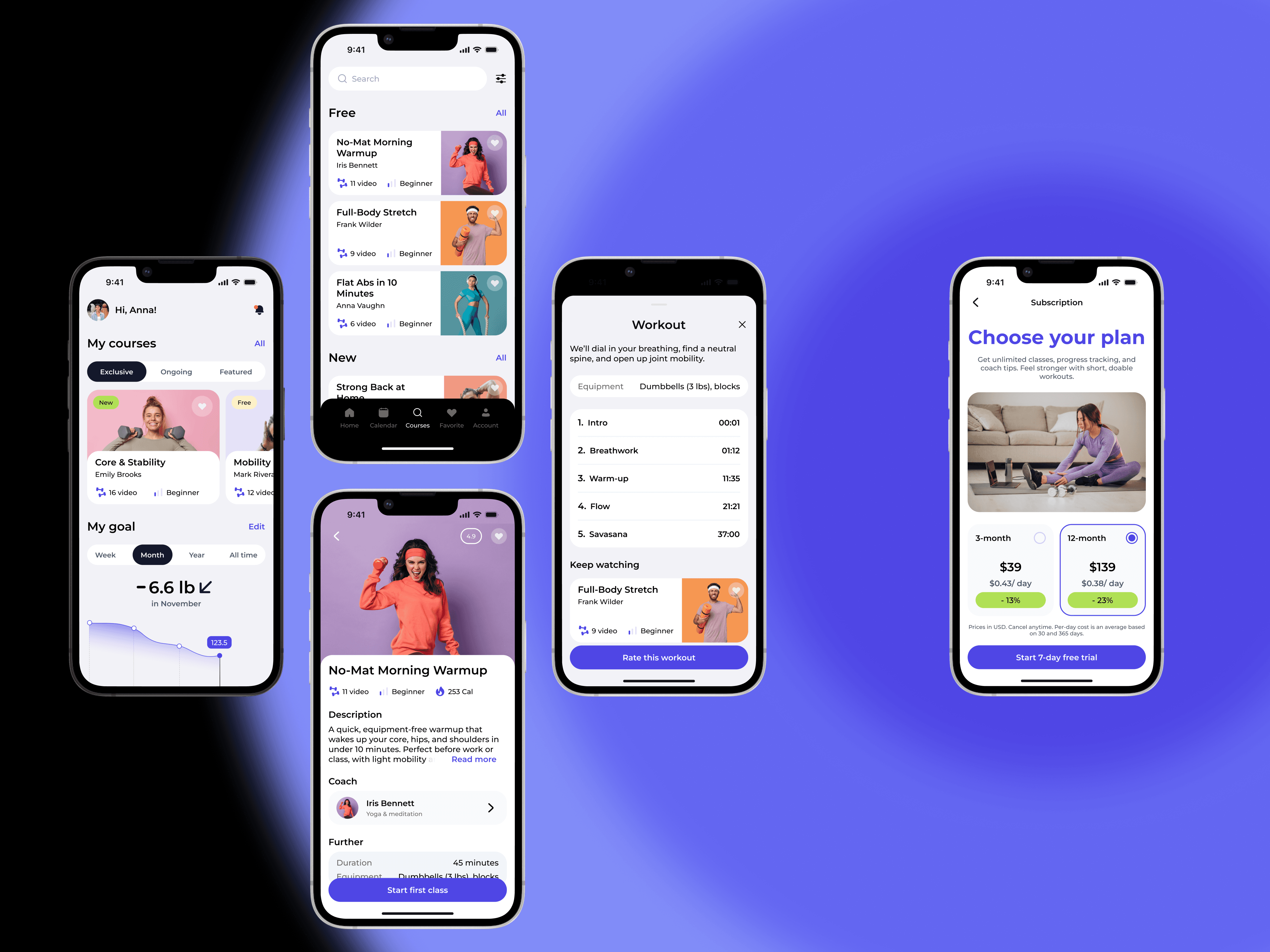A cross-platform fitness experience for home workouts and guidance. The goal was faster starts, consistent habits, and visible progress. I led end-to-end UX and UI, built a clean design system, responsive layouts for desktop and mobile, and motivation loops like streaks and weekly targets.